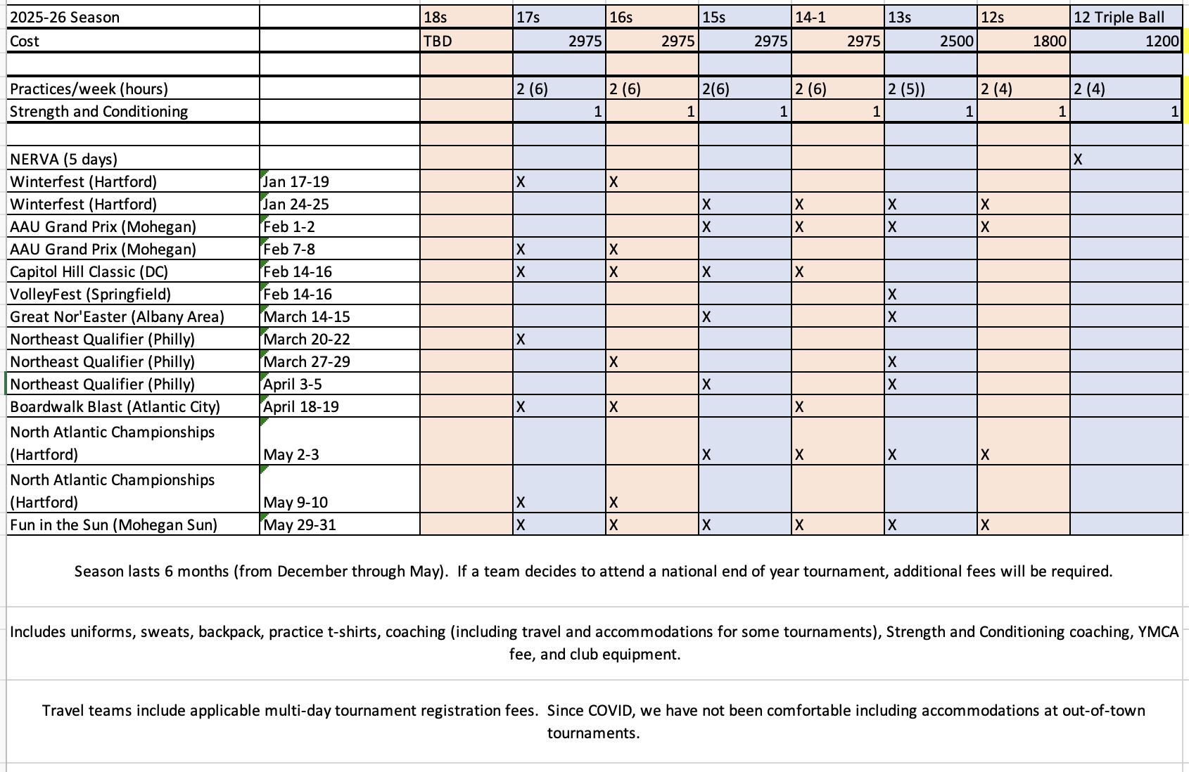The Club Season lasts from December through May. If a team decides to attend a national end of year tournament, additional fees will be required. Tuition includes 2 practices a week, uniforms, sweats, backpack, practice t-shirts, tournament entry fees, coaching (including coach travel and accommodations for some tournaments), weekly strength and conditioning sessions, YMCA fee, and club equipment. Team members must all stay in the club hotel at events requiring an overnight stay. USA Volleyball and AAU memberships are additional.